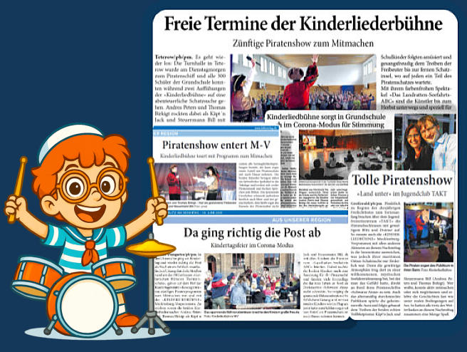 29.01. 2 x in Ribnitz-Damgarten30.01. 2 x im Landkreis Vorpommern Greifswald05.02. Fischland Darß11.02. 2 x in Hamburg12.02. Lübeck14.02. 2 x in Kiel27.02. Landkreis Rostock 28.02. 3 x im Landkreis Nordwestmecklenburg01.03. Insel Usedom19.03. Waren31.03. Bützow02.04. Neubrandenburg03.04. Insel Usedom06.05. Greifswald07.05. Neubrandenburg17.05. Landkreis Vorpommern-Rügen24.05. Landkreis Mecklenburgische-Seenplatte02.06. 2 x im Landkreis Rostock03.06. Landkreises Ludwigslust-Parchim05.06. Landkreis Mecklenburgische-Seenplatte10.06. Elbe-Elster11.06. 2 x Potsdam-Mittelmark19.06. Teltow-Fläming24.06. Dahme-Spreewald25.06. 2 x Oder-Spree27.06. Landkreis Ludwigslust-Parchim 01.07. Vorpommern-Greifswald02.07. Vorpommern-Greifswald04.07. 2 x Neubrandenburg14.07. 2 x Stralsund22.07. Piratenfest Bad Doberan23.07. 2 x Rostock24.07. Insel Rügen25.07. 2 x Berlin Prenzlauer Berg28.07. 2 x Berlin Friedrichshain-Kreuzberg29.07. 2 x Berlin Charlottenburg-Wilmersdorf07.08. Prenzlau 11.08. Pasewalk 12.08. Landkreis Mecklenburgische-Seenplatte16.08. 2 x Vorpommern-Greifswald10.09. Insel Rügen23.09. 2 x im Landkreis SaalekreisEin herzliches Dankeschön für den wunderbaren Frühstücksempfang und die liebevoll gestalteten Töpferarbeiten der Kinder in Mücheln zum »Tag der Zahngesundheit 2025«.24.09. Landkreis Saalekreis25.09. 2 x Teltow-Fläming26.09. 2 x Dahme-Spreewald29.09. Landkreis Vorpommern-Rügen30.09. Landkreis Mecklenburgische-Seenplatte01.10. Insel Usedom02.10. 2 x Insel Usedom06.10. 2 x Dresden08.10. Saale-Orla-Kreis09.10. 2 x Saale-Orla-Kreis07.11. 2 x Landkreis Ludwigslust-Parchim10.11. Neustrelitz11.11. 2 x Waren (Müritz)19.11. Landkreis Ludwigslust-Parchim27.11. Landkreis Nordwestmecklenburg29.11. Insel Rügen 04.12. 2 x Landkreis Ludwigslust-Parchim08.12. Insel Rügen09.12. Landkreis Vorpommern-Rügen 10.12. Grimmen11.12. Insel Rügen16.12. Insel Rügen18.12. 2 x Strasburg (Uckermark) 19.12. Landkreis Ludwigslust-Parchim
