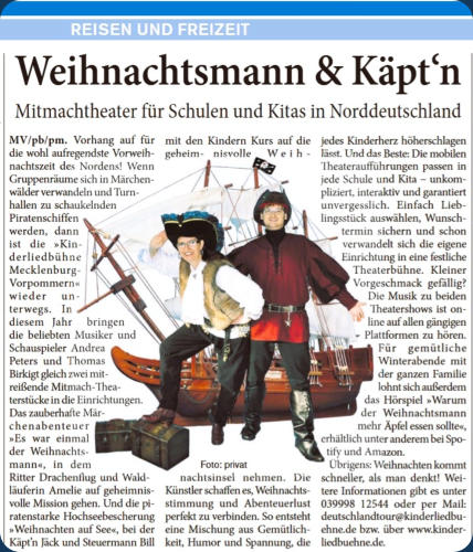 PIRATENWEIHNACHTOft sind es die kleinen Dinge, die anderen Freude bereiten. So erleben das auch der waschechte Piratenkapitän Käpt´n Jack und sein Steuermann Bill auf ihrem Hochseeabenteuer »Weihnachten auf SEE«. Doch zuvor muss das Weihnachtsfest ordentlich vorbereitet werden und dabei läuft zunächst nicht alles nach Plan. Als dann auch noch eines der wichtigsten Utensilien auf ihrem Piratenschiff verschwindet, müssen sie eine Entscheidung treffen, die auf dem Meer sehr gefährlich sein kann, aber nur so können sie die Weihnachtsinsel rechtzeitig zum Fest erreichen.Eine turbulente, musikalische Weihnachtsreise voller Spaß, Spannung und Herz – ideal für Kinder im Kita- und Grundschulalter. + Interaktive Mitmach-Shows+ Empfohlen für Vor- und Grundschulkinder+ Flexible Spieldauer ca. 45 Minuten+ Geeignet für Kitas, Grundschulen und Freilichtbühnen